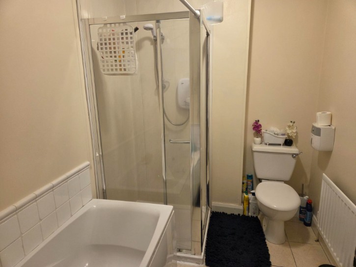 Panel bath, Corner shower, Low flush wc, Pedestal wash hand basin, Single radiator, Tiled flooring