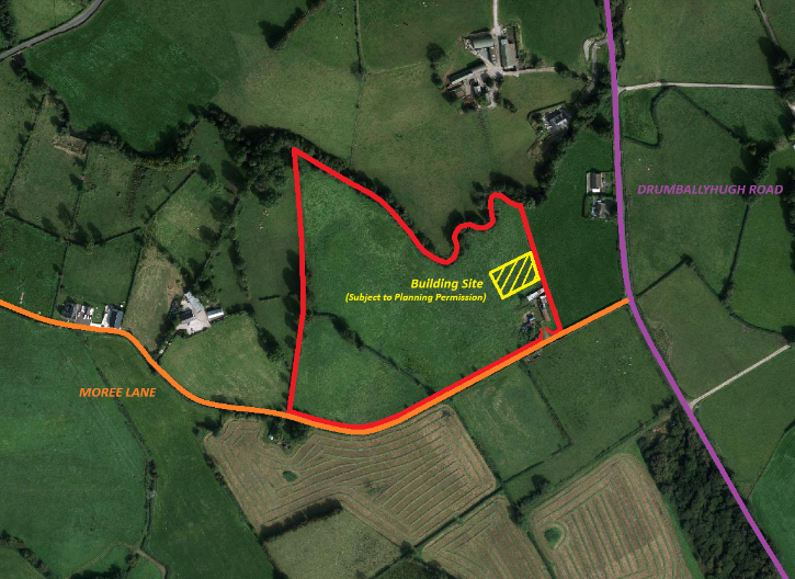 THIS LOT CONSISTS OF 10.95 ACRES OF AGRICULTURAL LAND SPLIT OVER 2 FIELD BOUNDARIES WITH FRONTAGE TO MOREE LANE JUST OFF DRUMBALLYHUGH ROAD. AN ESTABLISHED YARD IS ALSO PRESENT AND FEATURES A NUMBER OF HAY SHEDS, CATTLE HOLDING AREA AND PARTIALLY BUILT DWELLING.