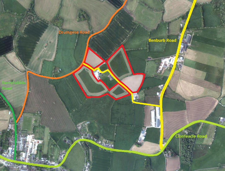 FOR SALE IN THIS HIGHLY SOUGHT-AFTER AREA, IS THIS OUTSTANDING ROADSIDE LOT OF HIGH QUALITY AGRICULTURAL LAND COMPLETE WITH MULTIPLE ACCESS POINTS FROM BOTH THE BENBURB ROAD AND DRUMGOSE ROAD. THIS LOT EXTENDS TO 22.85 ACRES IN TOTAL AND IS WELL LOCATED WITH ROAD FRONTAGE TO THE DRUMGOSE ROAD AND BENBURB ROAD, JUST OFF THE MAIN ROAD BETWEEN MOY AND BENBURB. SELDOM DOES A LOT SUCH AS THIS COME ON THE MARKET IN THIS AREA, AND WE WOULD HIGHLY RECOMMEND INSPECTION TO FULLY APPRECIATE THE LAND’S QUALITY AND LOCATION.