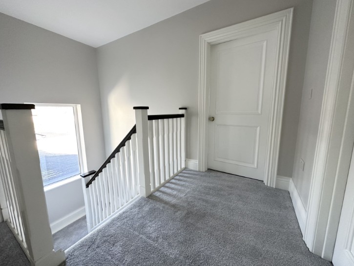 • Closed thread staircase, walnut finish handrails, finished with a central carpet runner.