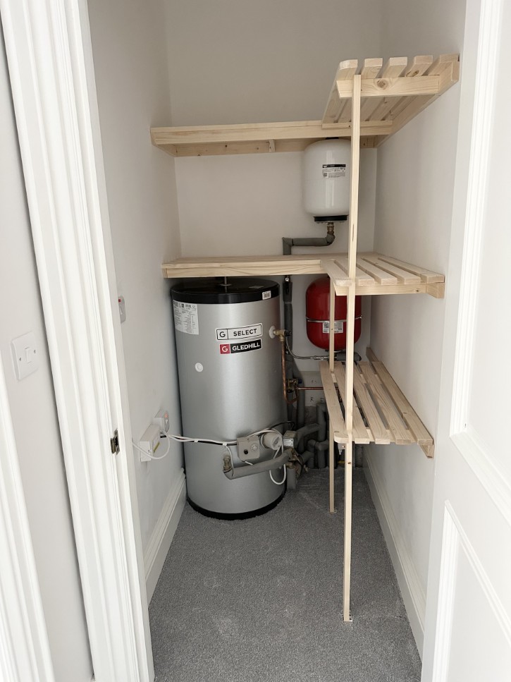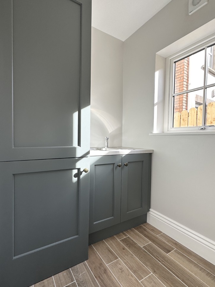 • Hand painted utility room, finished in “Farrow & Ball- Downpipe” with matching antique brass knobs, feature panelling & decorative shelf.