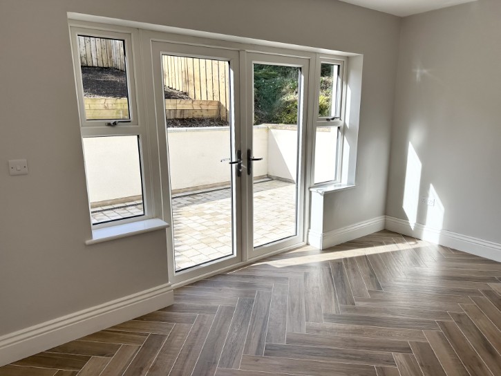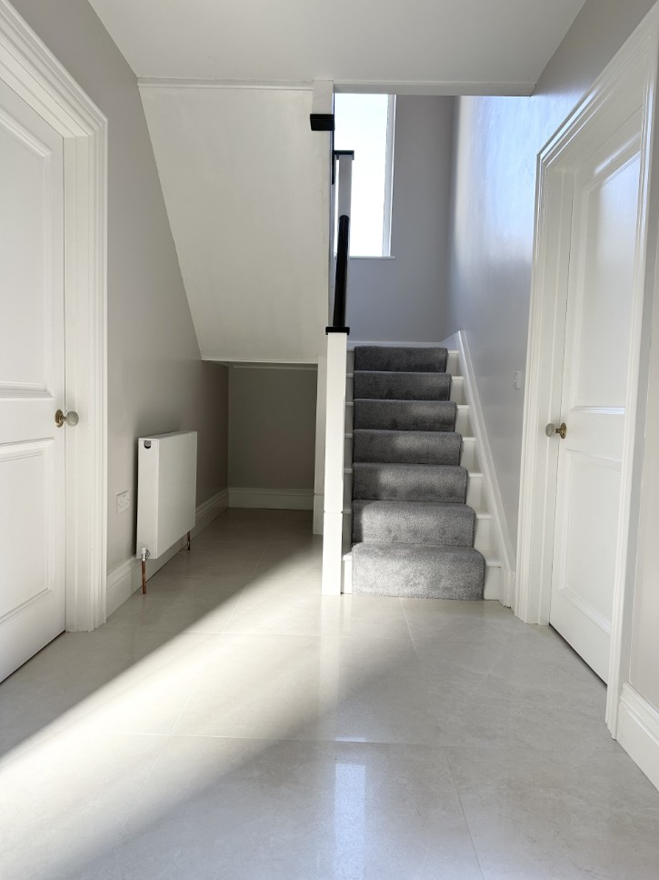 • Internal walls painted “Farrow & Ball - Ammonite” with the internal woodwork finished in gloss white.