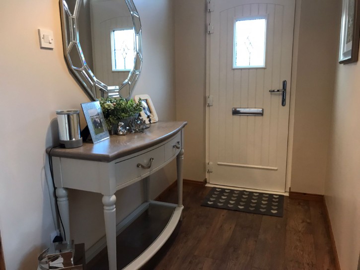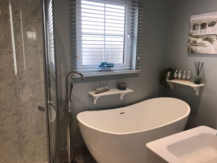 Close Coupled W/C, Sink in Vanity Unit, Free Standing Bath, Corner Electric Shower, Laminated Flooring, Heated Towel Rail