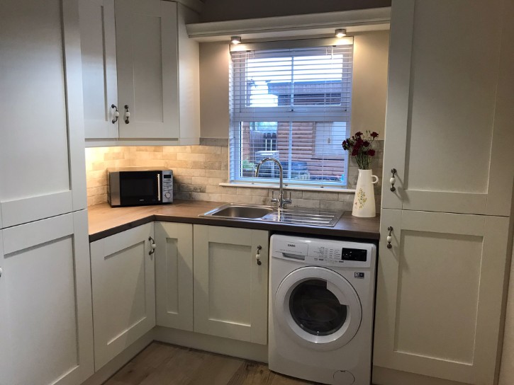 Range of High and Low Level Units, Single Drainer Stainless Steel Sink, Splash Back Tiling, Integrated fridge freezer, Plumbed for Washing Machine, Tiled Flooring, Double Radiator