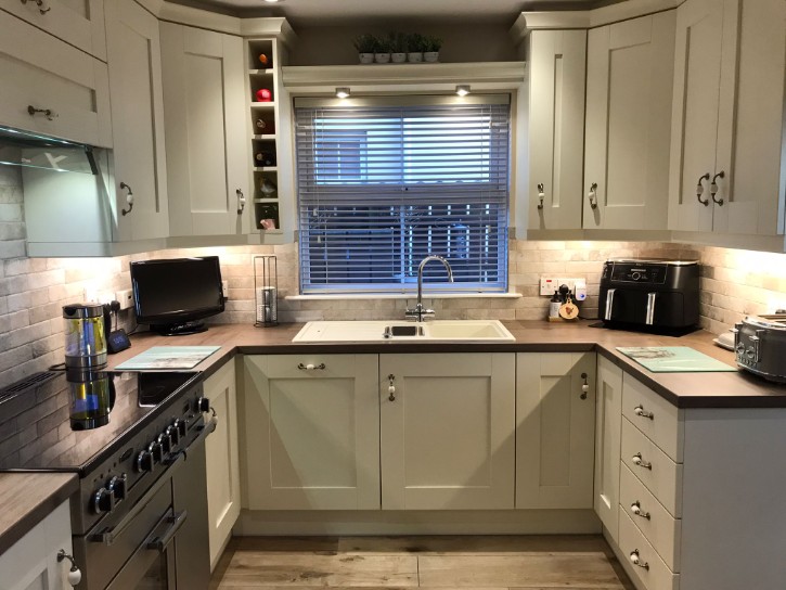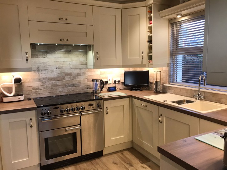 Range of High and Low Level Units, Single Drainer Stainless Steel Sink, Splash Back Tiling, Integrated dishwasher, Rangemaster Electric Cooker, Tiled Flooring