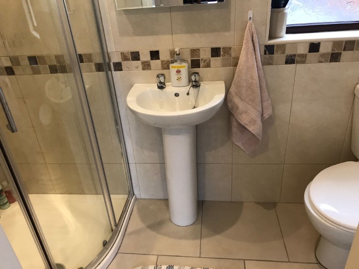 Close Coupled W/C, Pedestal with Hand Basin, Corner Shower, Single Radiator, Tiled Floor, Tiled Walls