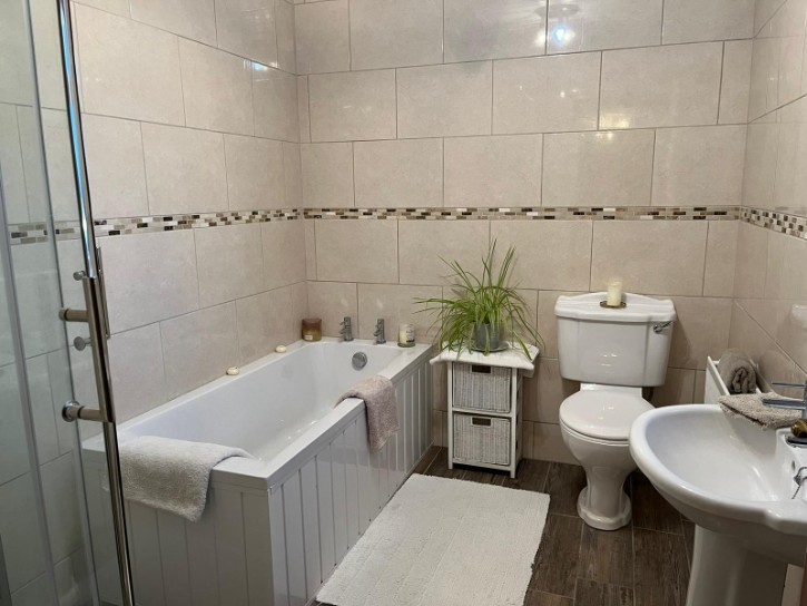 Tiled Floor, Fully Tiled Walls, Panel Bath, Pedestal with Hand Basin, Low Flush W/C, Shower, Double Radiator