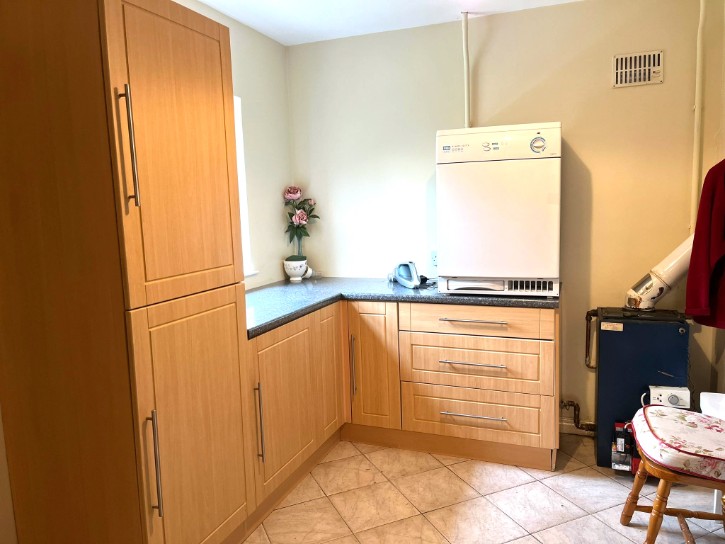 Range of High and Low Level Units, Single Drainer Stainless Steel Sink, Tiled Flooring, Plumbed for Automatic Washing Machine.