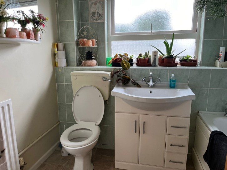 Low Flush W/C, Sink in Vanity Unit, Panel Bath, Linoleum Flooring, Tiled Walls, Single Radiator