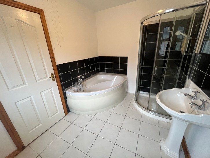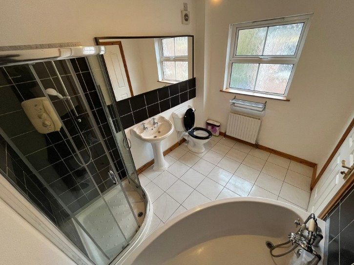 Corner Panel Bath with Shower Over, Corner Shower Enclosure, Pedestal with Hand Basin, Low Flush W/C, Double Radiator, Tiled Flooring