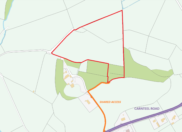 Joining the market is this lot of agricultural land on the Carnteel Road, Aughnacloy. The lot extends to 13.21 acres in total and is well located just outside the town. The land constitutes a single block of good quality land suitable for various agricultural ventures. The land is subdivided into two fields with a small wooded area to the south of the plot. Bounded by mature hedgerows and trees, the holding is accessed via a shared lane opening onto the main Carnteel Road.