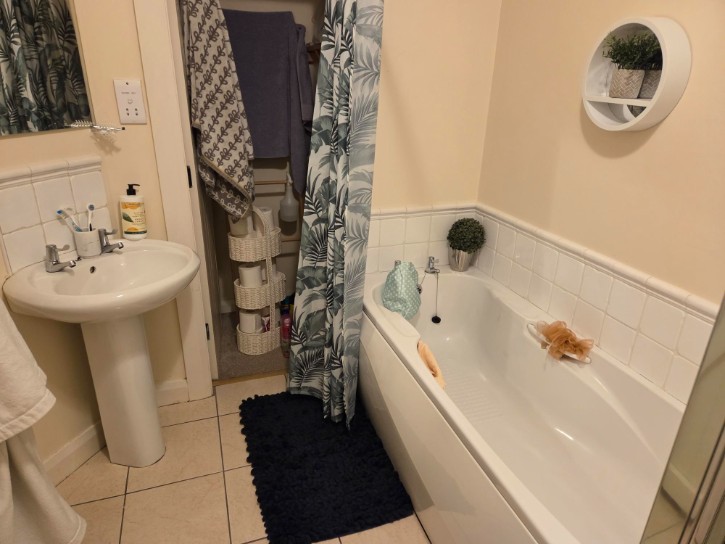 Panel bath, Corner shower, Low flush wc, Pedestal wash hand basin, Single radiator, Tiled flooring