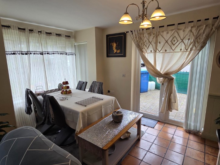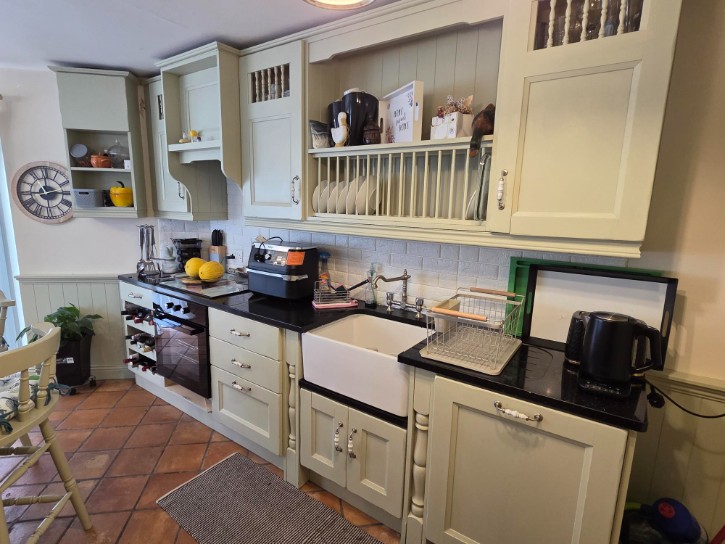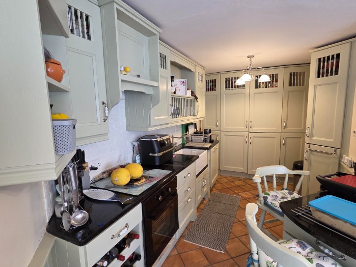 Range of high and low level units, single drainer ceramic sink, tile flooring, single radiator, Patio doors