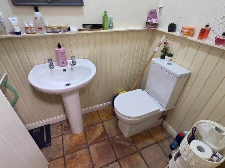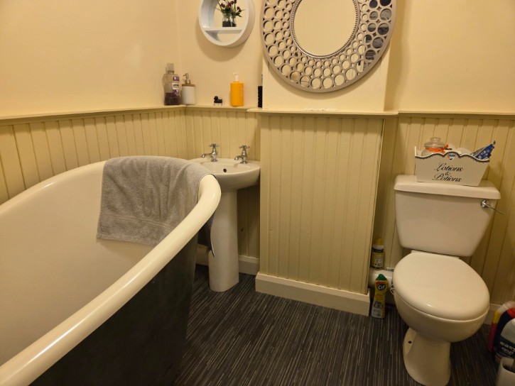 Lino flooring, low flush WC, pedestal wash hand basin, bath, single radiator