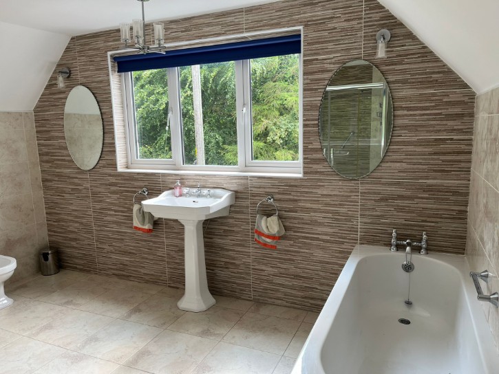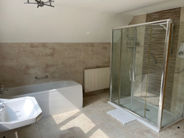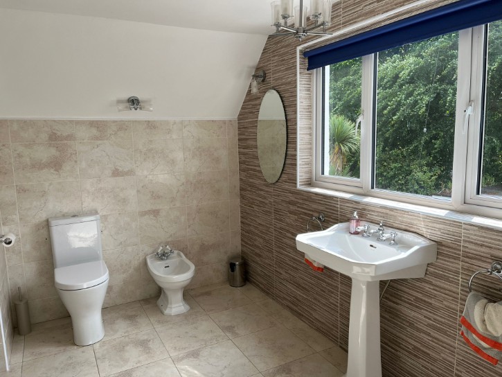 Extra Large Electric Shower, Close Coupled W/C, Pedestal with Hand Basin, Panel Bath, Bidet, Fully Tiled Walls, Tiled Flooring, Double Radiator, Hot-press