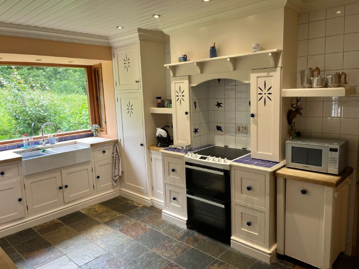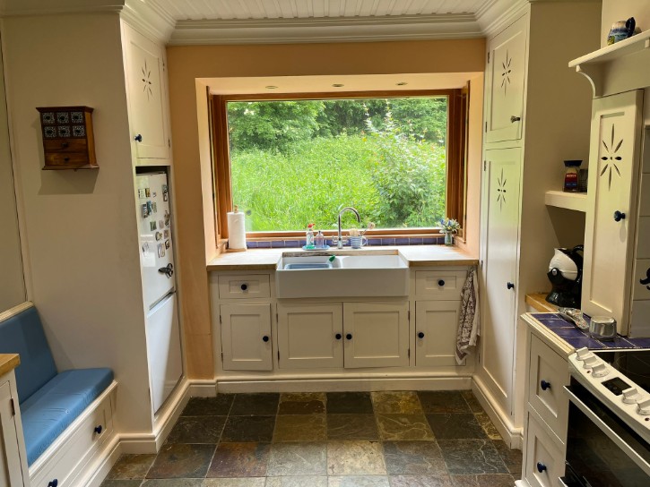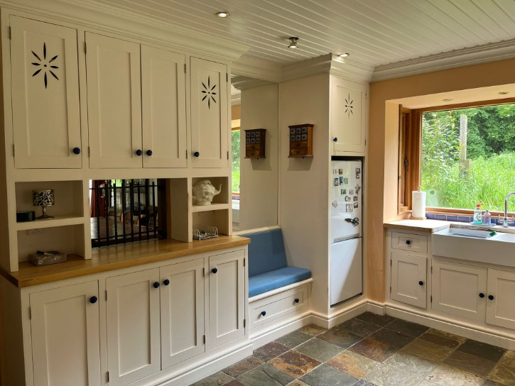 Bespoke In-Frame Kitchen, Natural Slate Flooring, Belfast Sinks, Serving Hatch, Downlighting, Painted Wooden Ceiling
