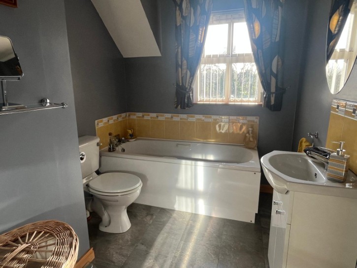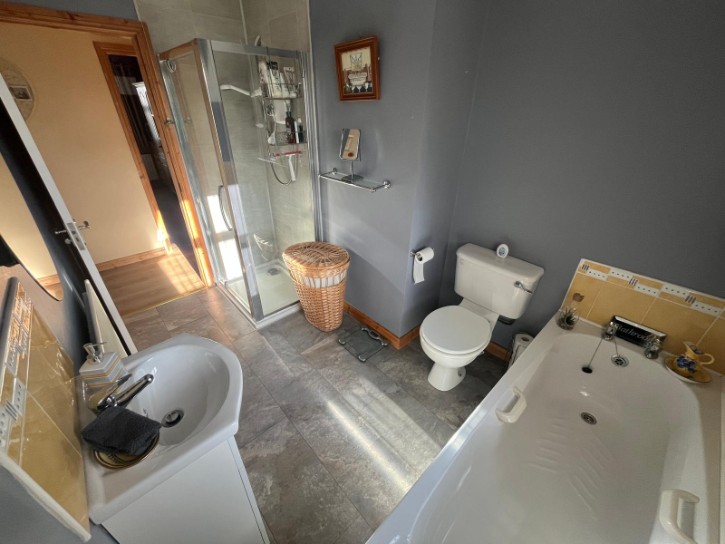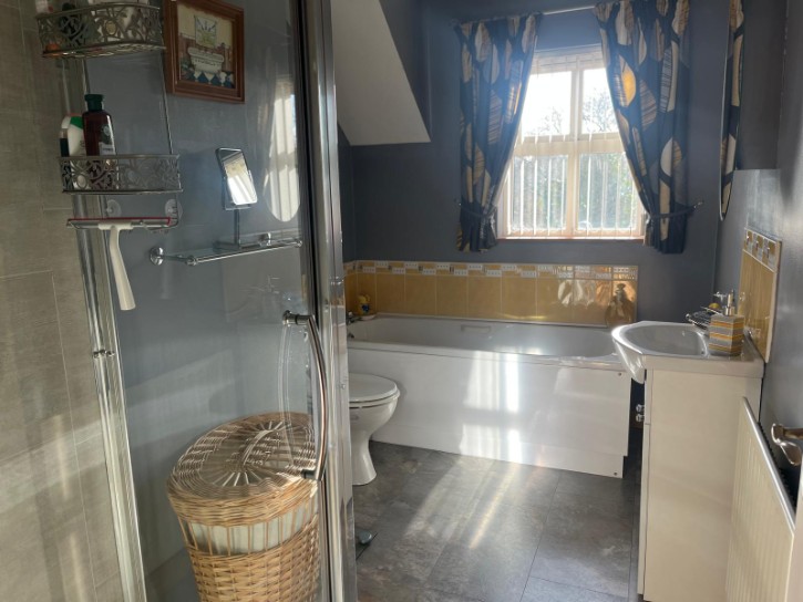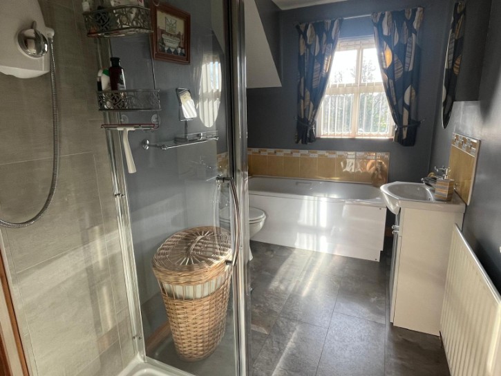 Panel Bath, Low Flush W/C, Sink in Vanity Unit, Power Shower, Wooden Flooring, Single Radiator