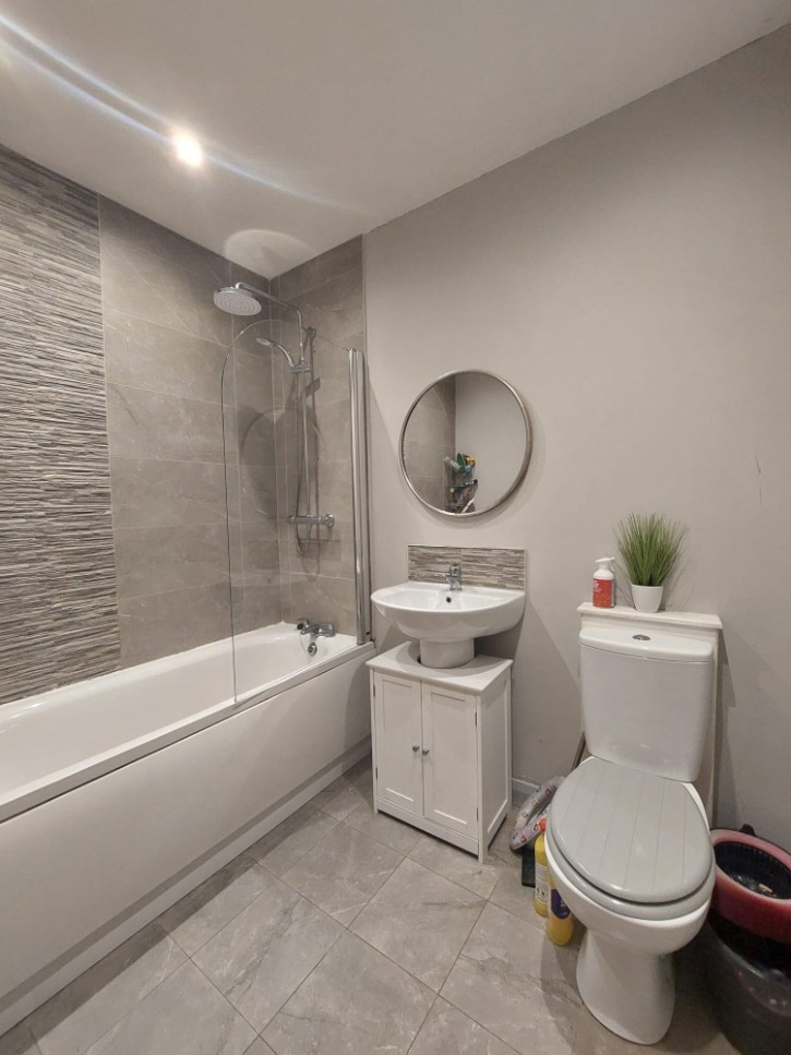 Panel Bath with Shower Over, Pedestal with Hand Basin, Closed Couple W/C, Tiled Flooring, Double Radiator