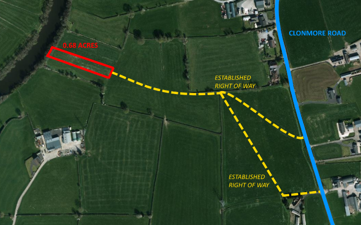 JOINING THE SALES MARKET IS THIS CIRCA 0.68 ACRE LOT OF AGRICULTURAL LAND IN A SINGLE FIELD BOUNDARY. THE LAND IS OF LEVEL TOPOGRAPHY AND IS BOUNDED ON ONE SIDE BY THE RIVER BLACKWATER. THE PLOT DOES NOT FEATURE DIRECT ROAD FRONTAGE, BUT IS ACCESSED VIA AN ESTABLISHED RIGHT OF WAY WITH TWO ENTRANCES TO CLONMORE ROAD.