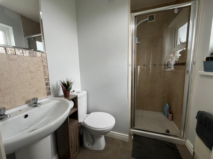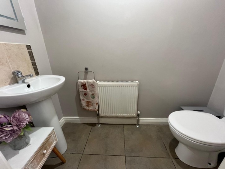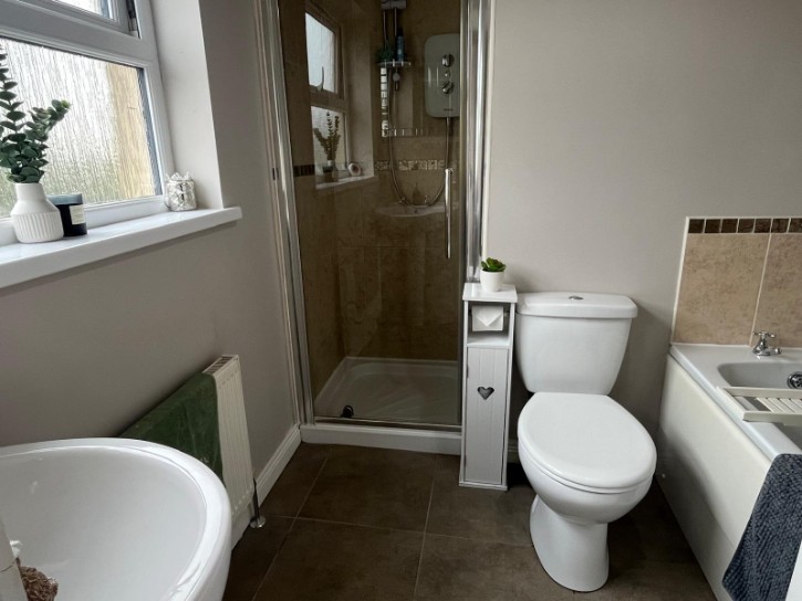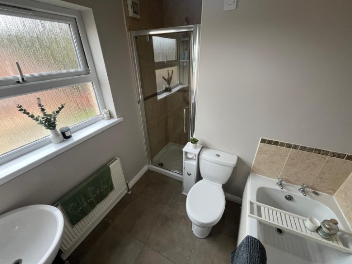 Close coupled WC, Pedestal wash hand basin, electric shower, tiled flooring, single radiator