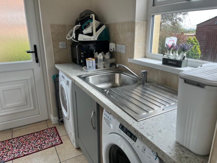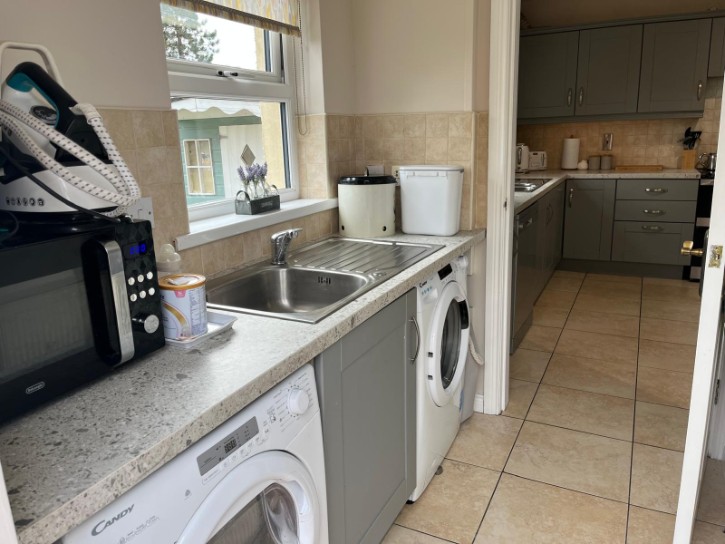 Range of high and low level units, single drainer stainless steel sink, plumbed for automatic washing machine, splash back tiling, tiled flooring, single radiator